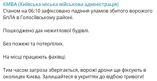 В Киеве в Голосеевском районе зафиксировано падение обломков сбитого вражеского БПЛА, сообщает КГВА. Повреждена крыша нежилого здания.