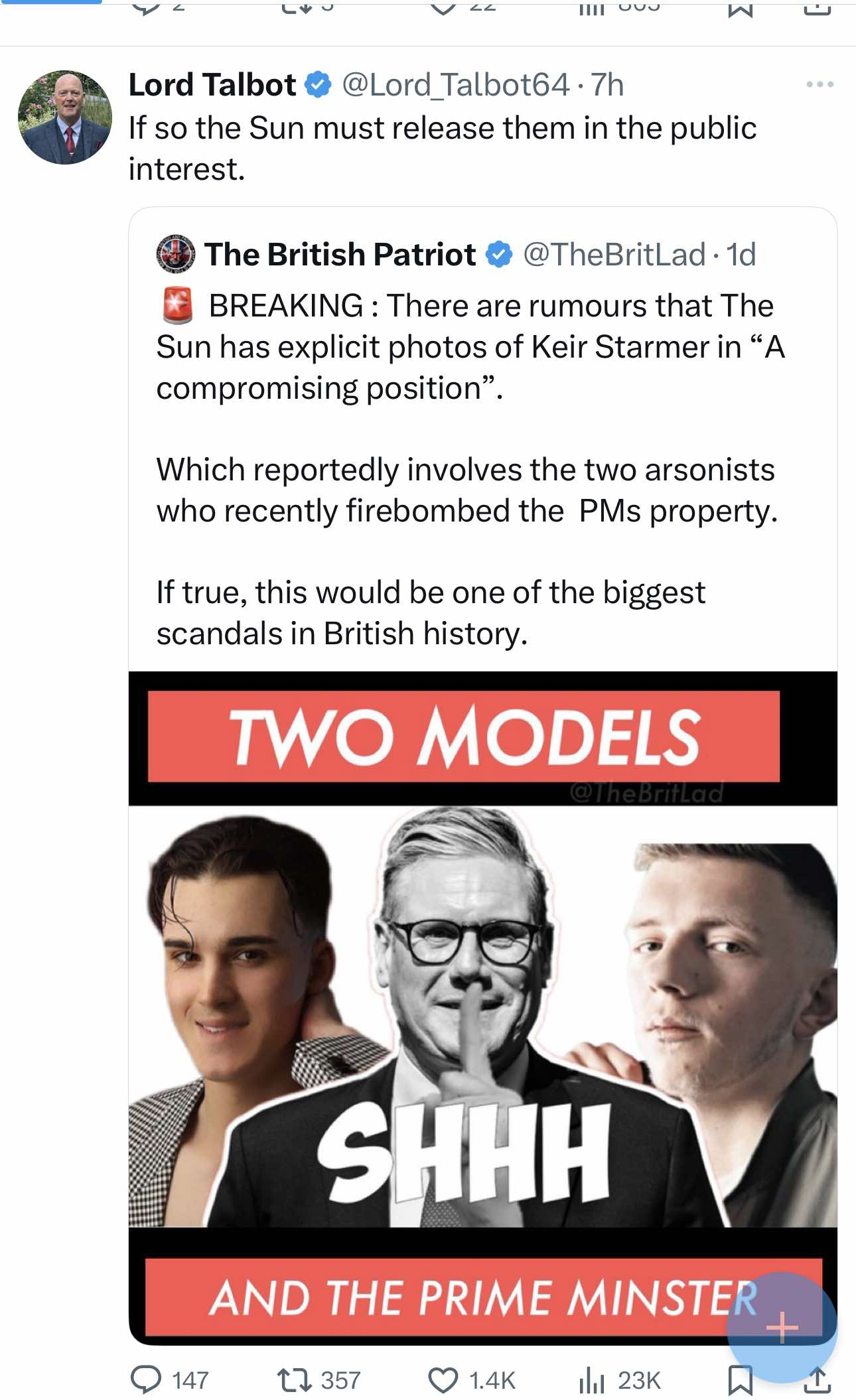 В британских соцсетях пошли слухи, что Стармер якобы был знаком с парнями, а их самих называют эскортниками и rent boys (мальчиками по вызову). И, дескать, парни отомстили ему за то, что тот якобы с ними не расплатился. Британский премьер никак это не комментирует. Существует неподтвержденное утверждение в соцсети X, в котором говорится: «Стармер сказал, что украинец Роман Лавринович, который поджег его дом, был не мальчиком по вызову, а украинским беженцем, с которым он играл в карты» (публично премьер Британии такого не заявлял, вероятно, имеется в виду слив от полиции).