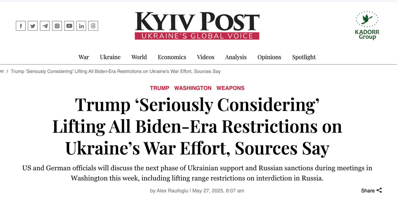 Президент США Дональд Трамп серьёзно рассматривает возможность снять все ограничения, наложенные его предшественником Джо Байденом на военные действия Украины.