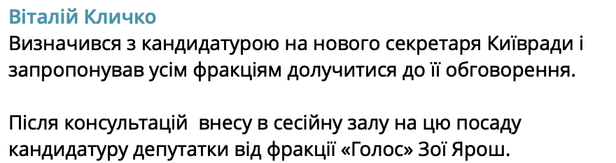 "Определился с кандидатурой на нового секретаря Киевсовета и предложил всем фракциям присоединиться к его обсуждению. После консультаций внесу в сессионный зал на этот пост кандидатуру депутата от фракции "Голос" Зои Ярош", - написал Кличко.