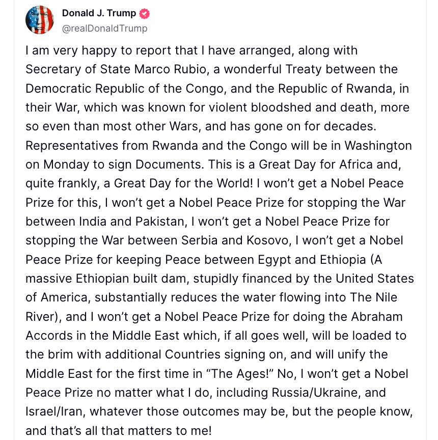 "Я не получу Нобелевскую премию мира, что бы я ни делал, включая Россию/Украину, Израиль/Иран, какими бы ни были эти результаты, но люди знают, и это все, что имеет для меня значение", - написал Трамп.