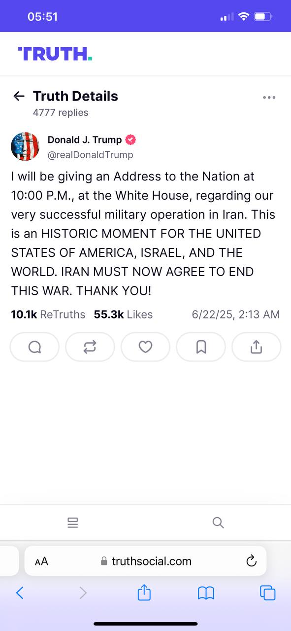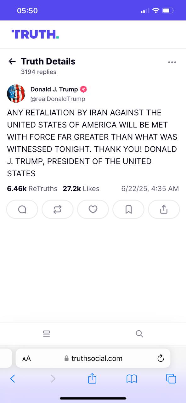 Трамп опубликовал еще два поста в своей соцсети, в которых потребовал от Ирана не отвечать на американский удар и "закончить войну". Также он угрожает ещё более мощным ударом, если Иран атакует американские силы в ответ на удар США по своим ядерным объектам.