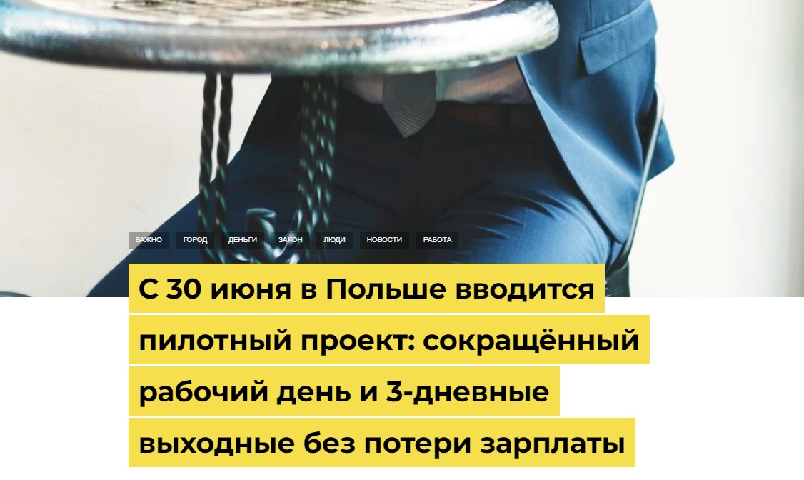 В Польше проведут эксперимент с четырехдневной рабочей неделей и сокращением рабочего дня без потери зарплаты. Проект Министерство семьи, труда и соцполитики Польши запускает с 30 июня.