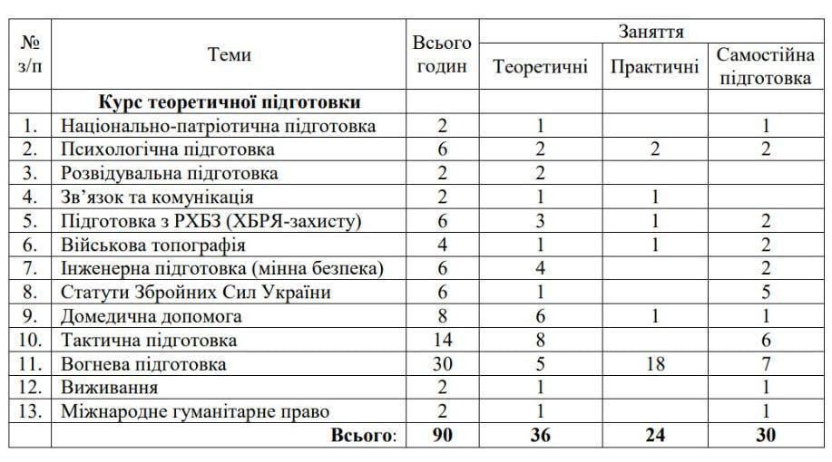 Основной акцент в теоретической части будет сделан на огневой подготовке - ей отводится 30 часов. Еще 14 часов посвятят тактической подготовке, 8 часов - домедицинской подготовке. По 6 часов будет уделено психологической подготовке студентов, защите от радиационной, химической и биологической угроз, минной безопасности и изучению уставов.