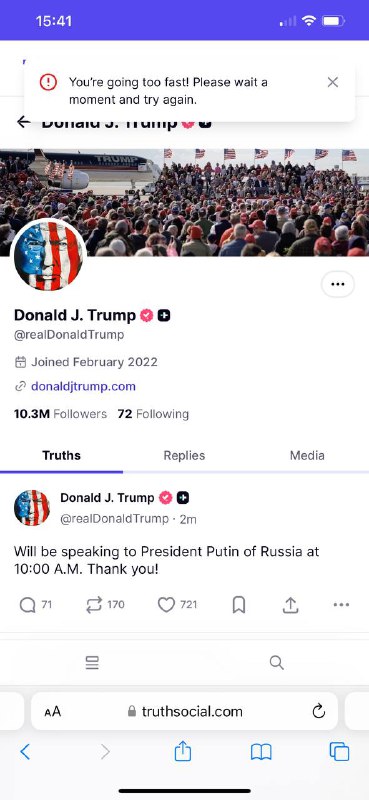 Трамп в своей соцсети подтвердил, что будет говорить сегодня с Путиным в 10:00 по Вашингтонскому времени (в 17:00 по Киеву).