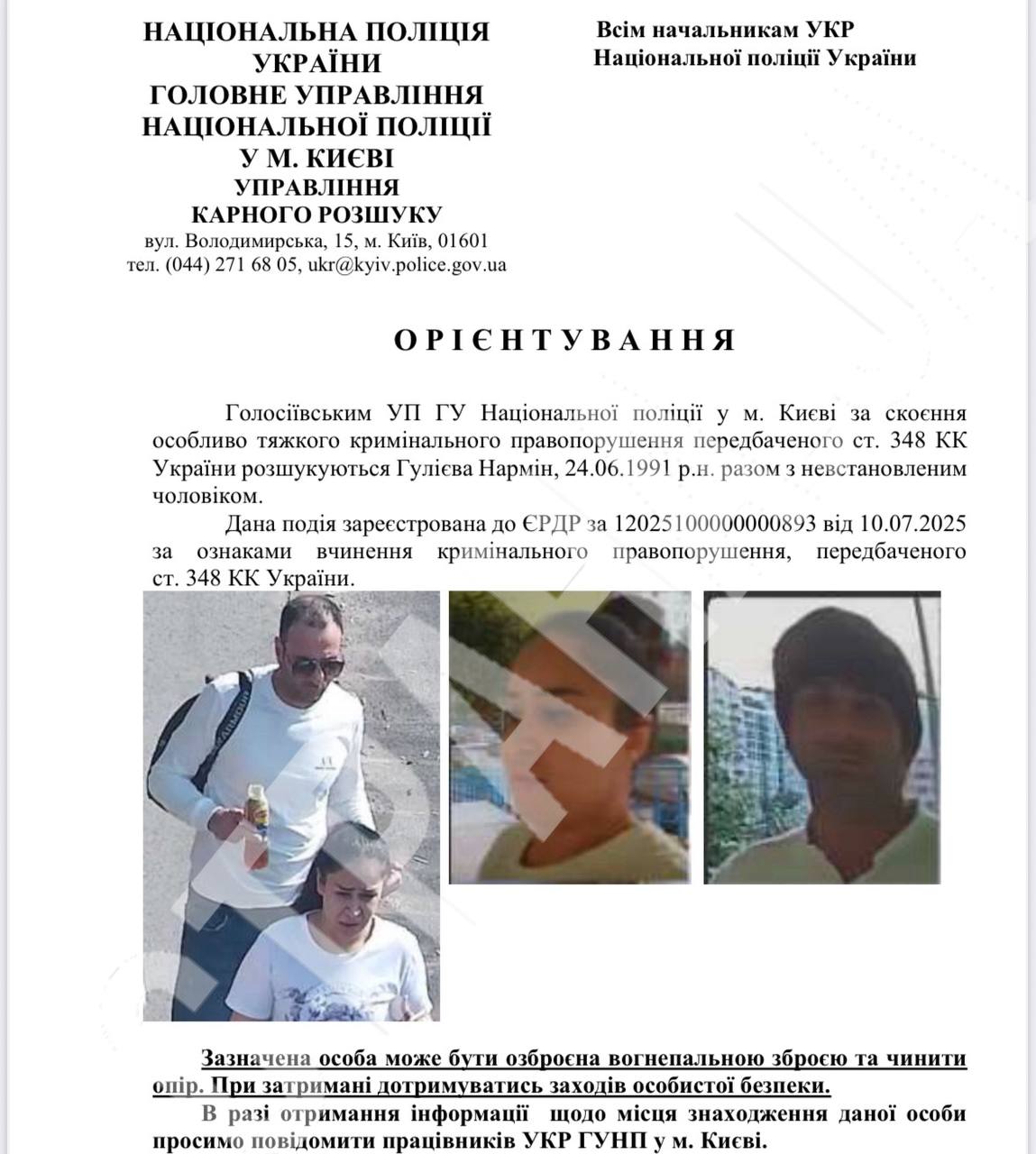 В распоряжении "Страны" оказалась ориентировка, на подозреваемых в убийстве. Речь идёт о Нармин Гулиевой, 1991 года рождения, и её неизвестном сообщнике. По данным полиции, подозреваемые могут быть вооружены и готовы к сопротивлению. В ориентировке прямо указано: при задержании соблюдать меры личной безопасности.