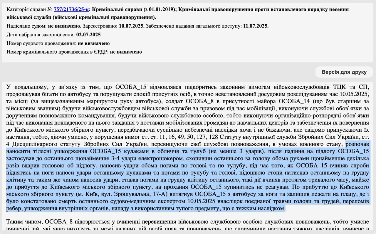 Как сообщает ГБР, по делу об убийстве мобилизованного проходит не только солдат, который непосредственно бил мужчину, но и заместитель начальника Подольского районного ТЦК в Киеве, который видел избиение, но не вмешался в ситуацию. Он тоже находится под стражей, ему грозит до 10 лет тюрьмы.