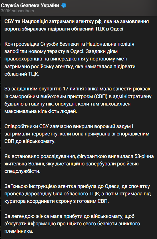 По версии следствия, завербованная РФ 53-летняя жительница Волыни уже провела разведку около областного ТЦК, забрала самодельную взрывчатку и должна была днем занести рюкзак с ней внутрь здания. Но ее задержали по дороге.