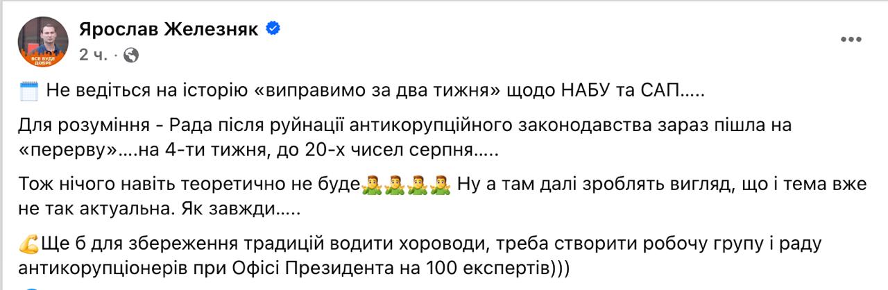 Об этом сообщает в своем телеграм-канале народный депутат из фракции "Голоса" Ярослав Железняк.