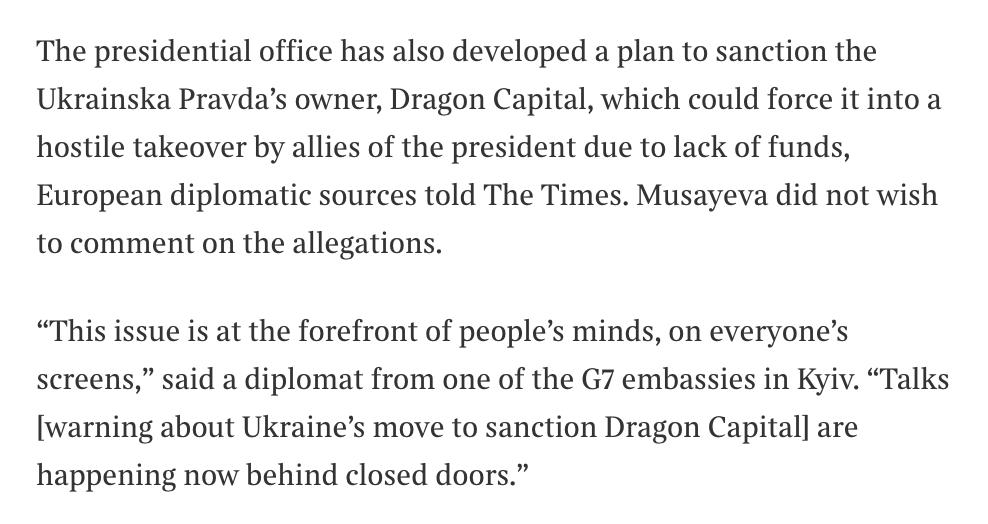 Times, со ссылкой на европейские дипломатические источники, пишет, что ОП разработал план введения санкций против принадлежащей Фиале инвестиционной компании Dragon Capital, которая владеет Украинской правдой.