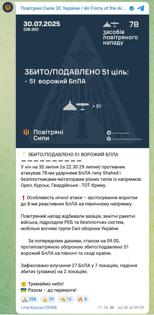 Из 78 БПЛА ("Шахеды" и имитаторы) сбить и подавить удалось 51.