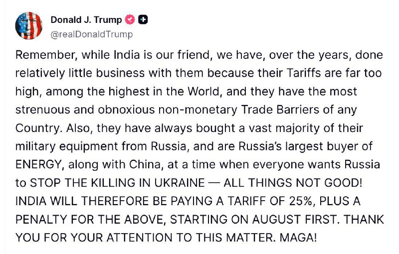 "Индия всегда покупала большинство своего военного оборудования в России и является крупнейшим покупателем энергии в России вместе с Китаем, в то время как все хотят, чтобы Россия прекратила убийства в Украине – все это не хорошо!" - написал Трамп.