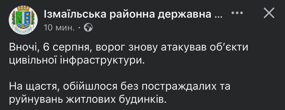 8.25 В ночь на 6 августа РФ атаковала объекты инфраструктуры в Измаильском районе.
