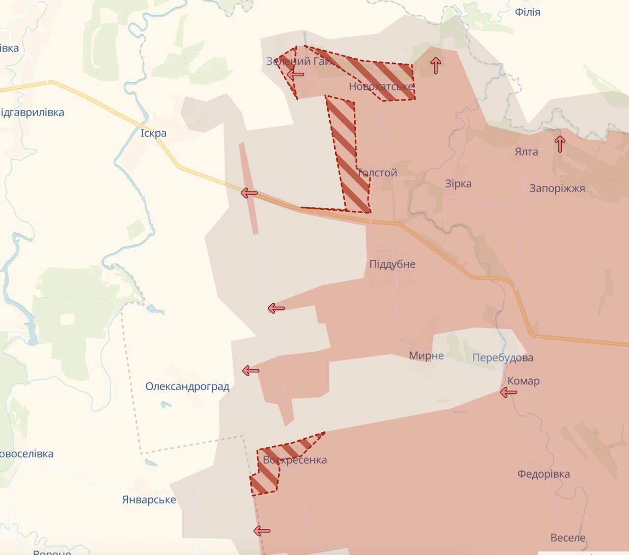 Российские войска захватили два села на границе Днепропетровской области - Новохатское и Толстой, а также продвинулись к Сичневому (Январскому) на территории Днепропетровщины. Об этом сообщает военный паблик Deep State.