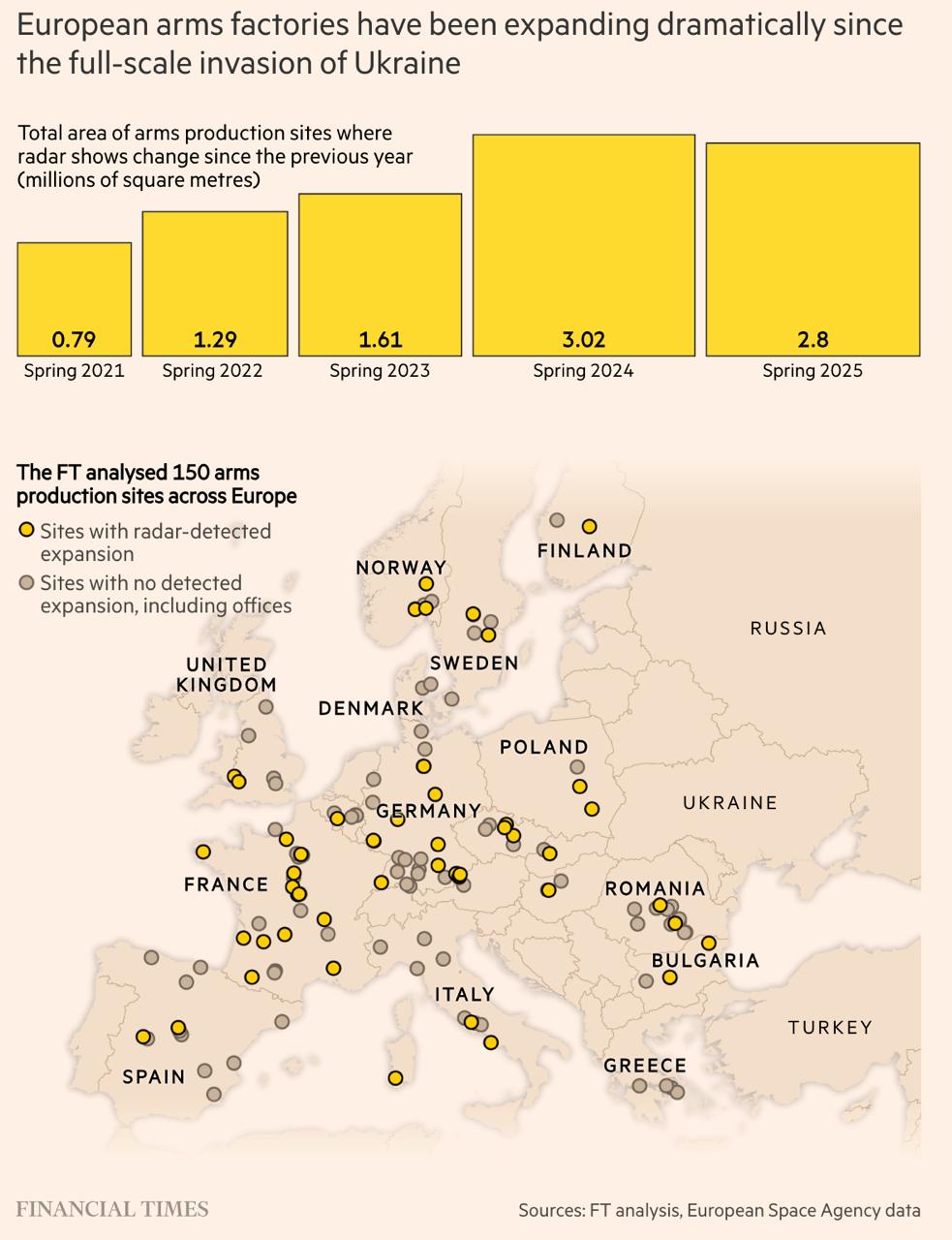 Расширение заводов происходит с начала войны в Украине. Издание проанализировало строительство объектов, связанных с производством боеприпасов и ракет — "двух слабых мест в поддержке Украины со стороны Запада". Оказалось, что появилось уже более 7 миллионов квадратных метров новых промышленных площадей. Примерно на трети обследованных участков были обнаружены следы расширения или строительства.