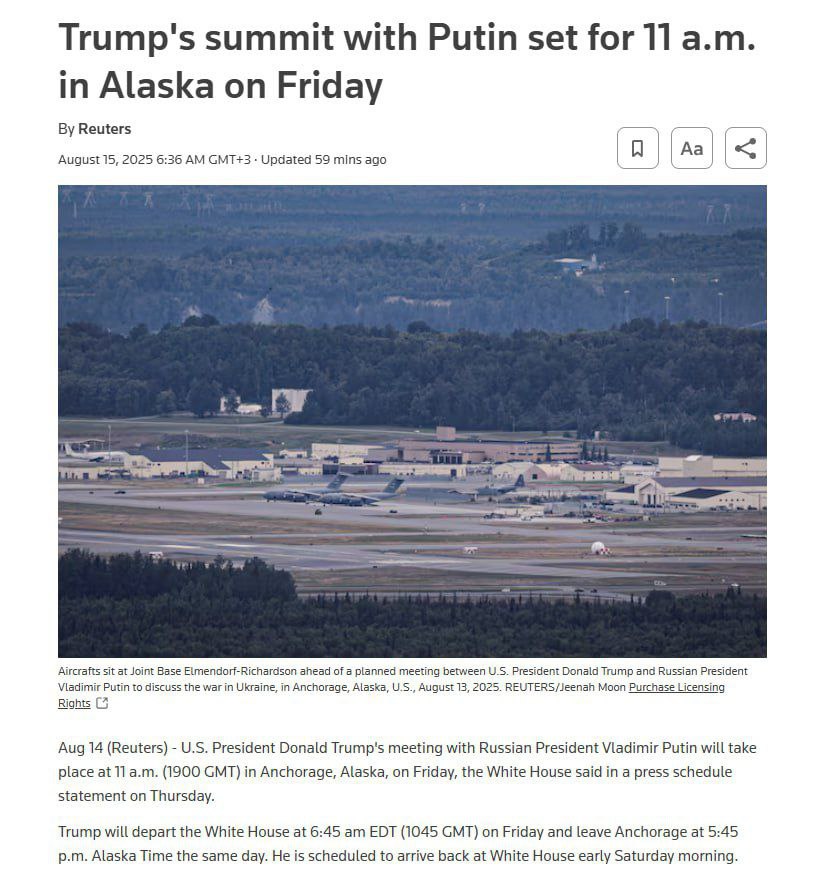 Встреча Трампа и Путина на Аляске начнётся сегодня, 15 августа, в 11:00 по местному времени, сообщает Белый дом, передает Reuters.
