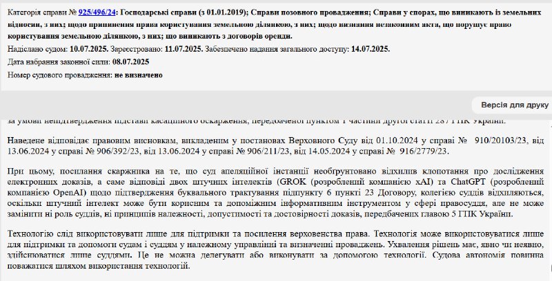 Искусственный интеллект может быть полезным и вспомогательным информативным инструментом в сфере правосудия, но не может заменить ни судью, ни принципы принадлежности, допустимости и достоверности доказательств, предусмотренные гл. 5 "Доказательства и доказывание" Гражданского процессуального кодекса Украины, добавили в суде.
