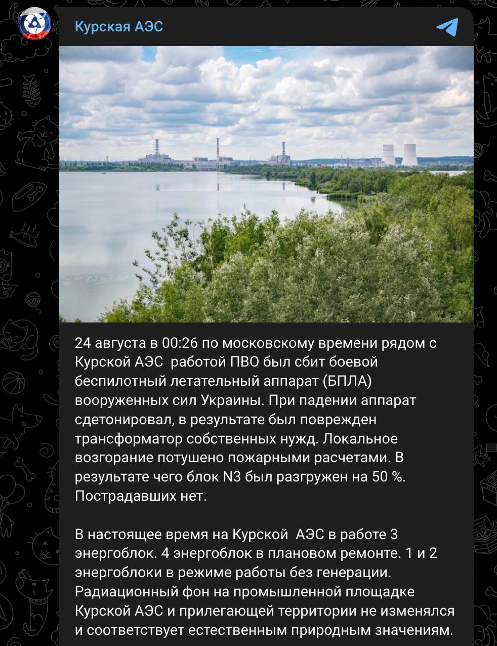 08:35 Из-за атаки беспилотника на Курской АЭС понизили мощность энергоблока, сообщает пресс-служба станции.