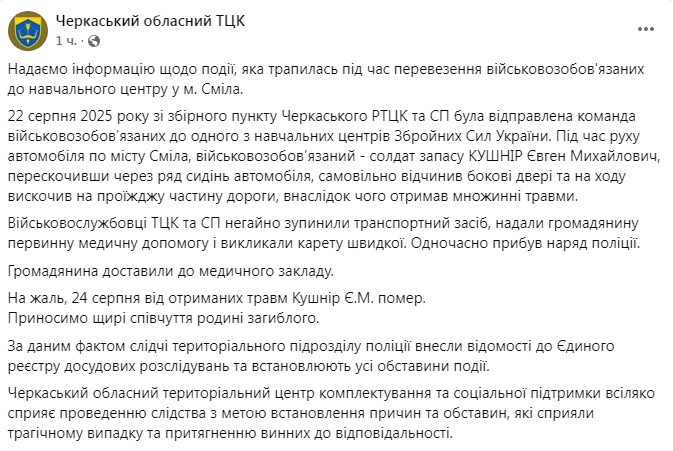 "22 августа из сборного пункта Черкасского РТЦК и СП была отправлена ​​команда военнообязанных в один из учебных центров Вооруженных сил Украины. Во время движения автомобиля по городу Смела военнообязанный, солдат запаса Кушнир Евгений Михайлович, перепрыгнув через ряд сидений автомобиля, самовольно открыл боковую дверь и на ходу выскочил на проезжую часть дороги, в результате чего получил множественные травмы. Гражданин был доставлен в медицинское учреждение. К сожалению, 24 августа от полученных травм Кушнир Е. М. скончался", - говорится в публикации ТЦК.