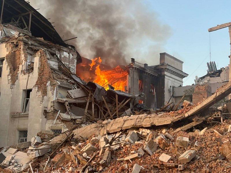 Потушить её смогли только сегодня утром. Об этом сообщает офицер сил обороны города Руслан Михайлевский. На публикуемых фото здание практически полностью разрушено.