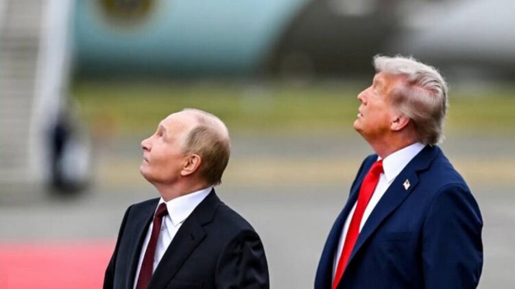 На фото Трамп и Путин стоят рядом и смотрят в небо.