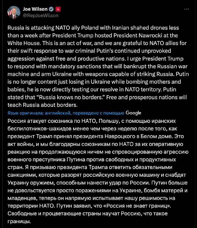 "Россия атакует союзника по НАТО, Польшу, с помощью иранских беспилотников "Шахед" менее чем через неделю после того, как президент Трамп принял президента Навроцкого в Белом доме. Это акт войны", - считает Уилсон.