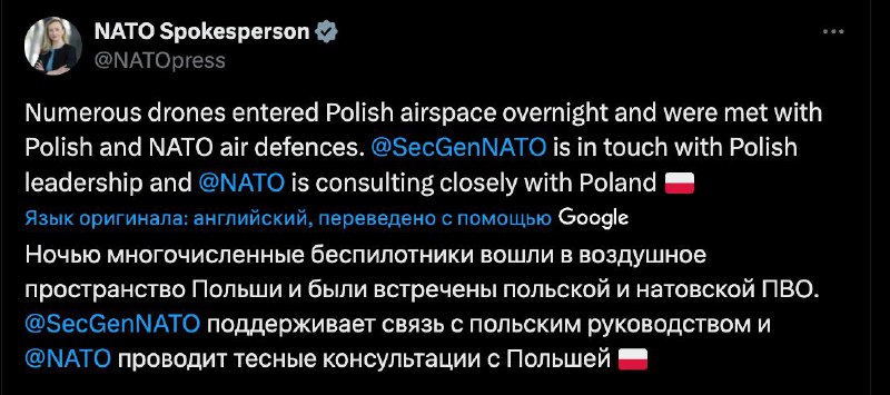 "Ночью многочисленные беспилотники вошли в воздушное пространство Польши и были встречены польской и натовской ПВО. Генеральный секретарь поддерживает связь с польским руководством, НАТО проводит тесные консультации с Польшей", - заявила представительница Альянса в Х.