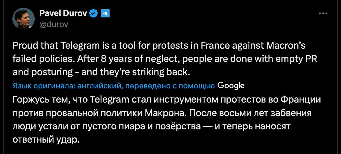 "Горжусь тем, что Телеграм стал инструментом протестов во Франции против провальной политики Макрона. После восьми лет забвения люди устали от пустого пиара и позёрства — и теперь наносят ответный удар", - сказано в публикации бизнесмена.