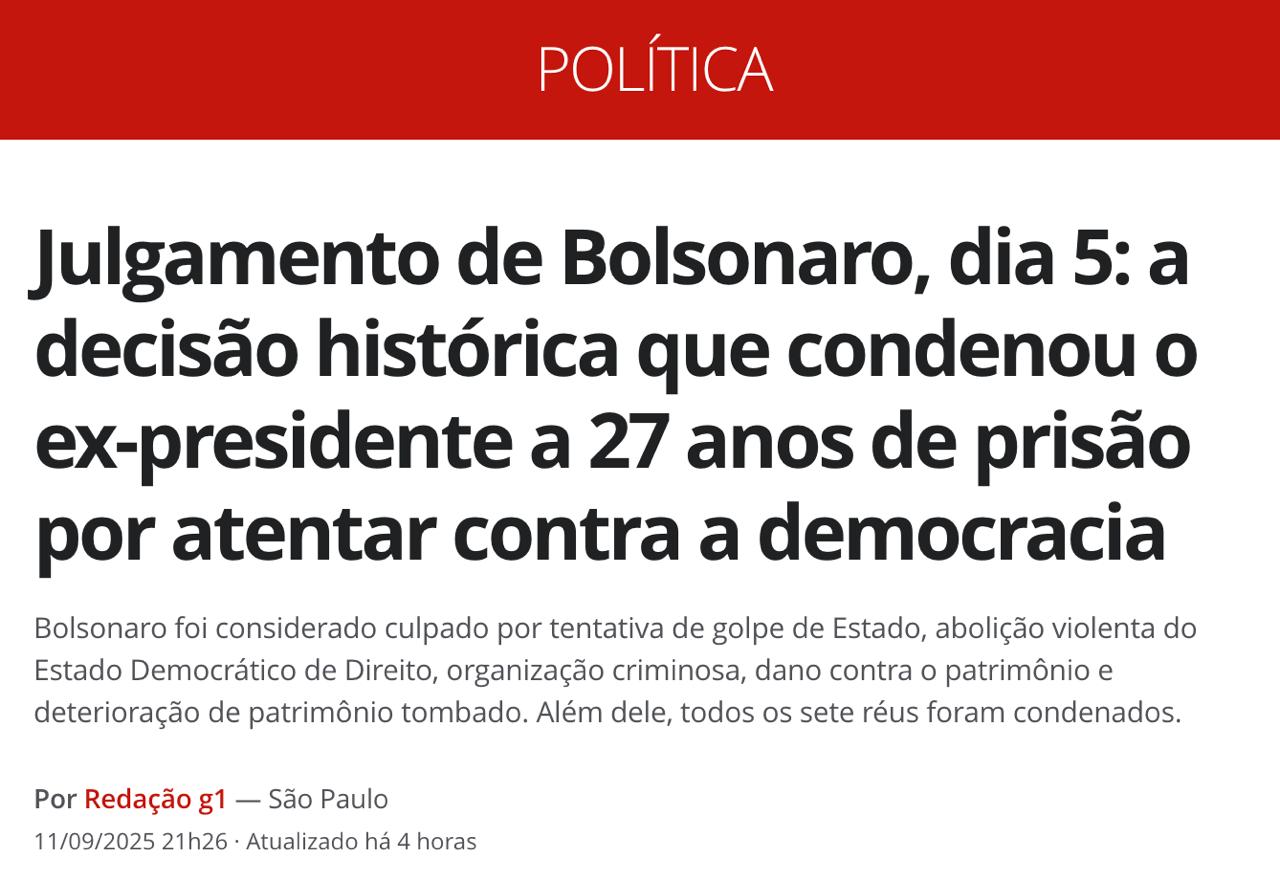 Бывшего президента Бразилии Жаира Болсонару коллегия из пяти судей Верховного суда страны приговорила к 27 годам тюремного заключения по делу о попытке государственного переворота.
