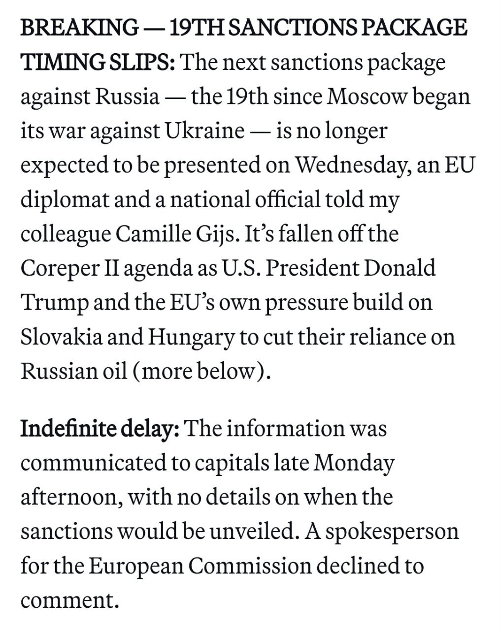 По данным издания, вопрос сняли с повестки Комитета постоянных представителей стран ЕС в Брюсселе. Причиной стало то, что президент США Дональд Трамп и сам Евросоюз сосредоточились на давлении на Словакию и Венгрию, требуя сократить их зависимость от российской нефти.