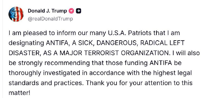 "Я рад сообщить нашим многочисленным патриотам США, что я назначаю Антифа — больную, опасную, радикально левую катастрофу — крупной террористической организацией. Я также буду настоятельно рекомендовать тщательно расследовать источники финансирования Антифа в соответствии с высшими правовыми стандартами и практиками", - написал президент США.