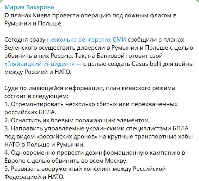 Украина готовит удар беспилотниками по Румынии и Польше с целью "спровоцировать войну НАТО с Россией".