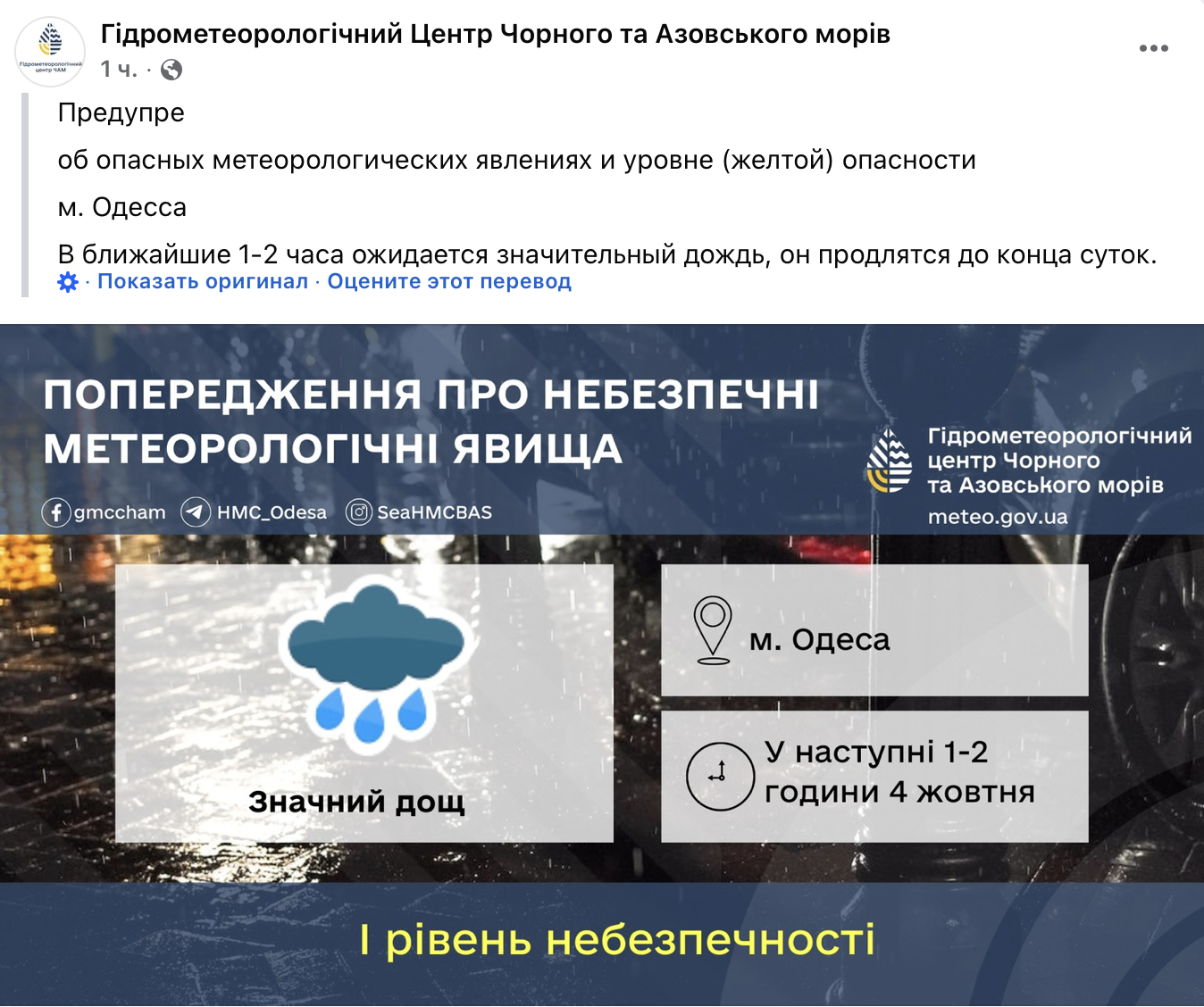 В Одессе ожидается повышенная опасности из-за дождя. В ближайшие 1-2 часа регион может настигнуть значительный дождь, который продлится до конца дня.