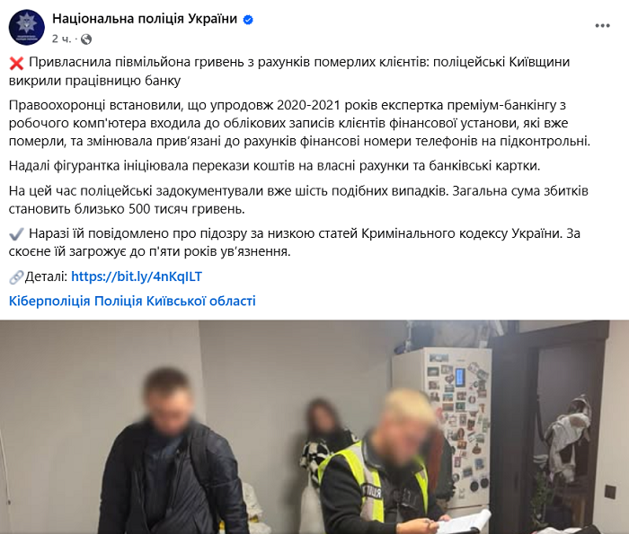 Полицейские Киевщины разоблачили сотрудницу банка, присвоившую полмиллиона гривен со счетов уже умерших клиентов.