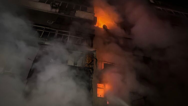 По словам мэра столицы Виталия Кличко, в Деснянском районе Киева произошло попадание "Шахеда" в девятиэтажный жилой дом на уровне второго-третьего этажей. Там возник пожар после попадания, спасатели эвакуировали 13 человек с верхних этажей.