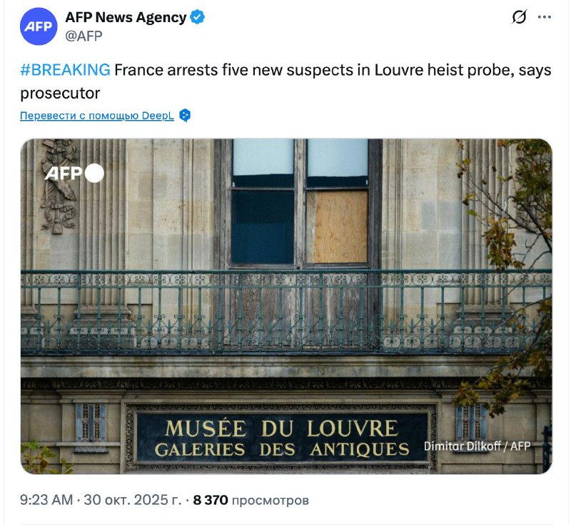 Полиция Франции задержала новых подозреваемых по делу об ограблении Лувра. Их пятеро.