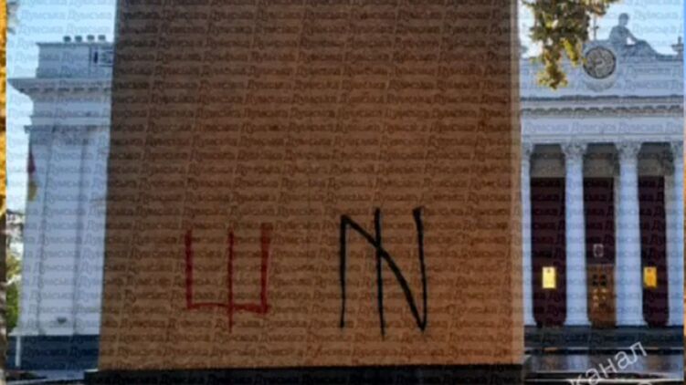 Как заметно на кадрах, после заколачивания памятника на доски уже нанесли краской из баллоничка трезубец и символику "Азова" - вариацию на тему волчьего крюка.