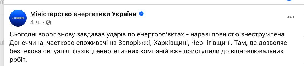 16:45 Помимо блэкаута в Донецкой области (речь о подконтрольной ВСУ части), проблемы со светом также в Запорожской, Харьковской и Черниговской областях.