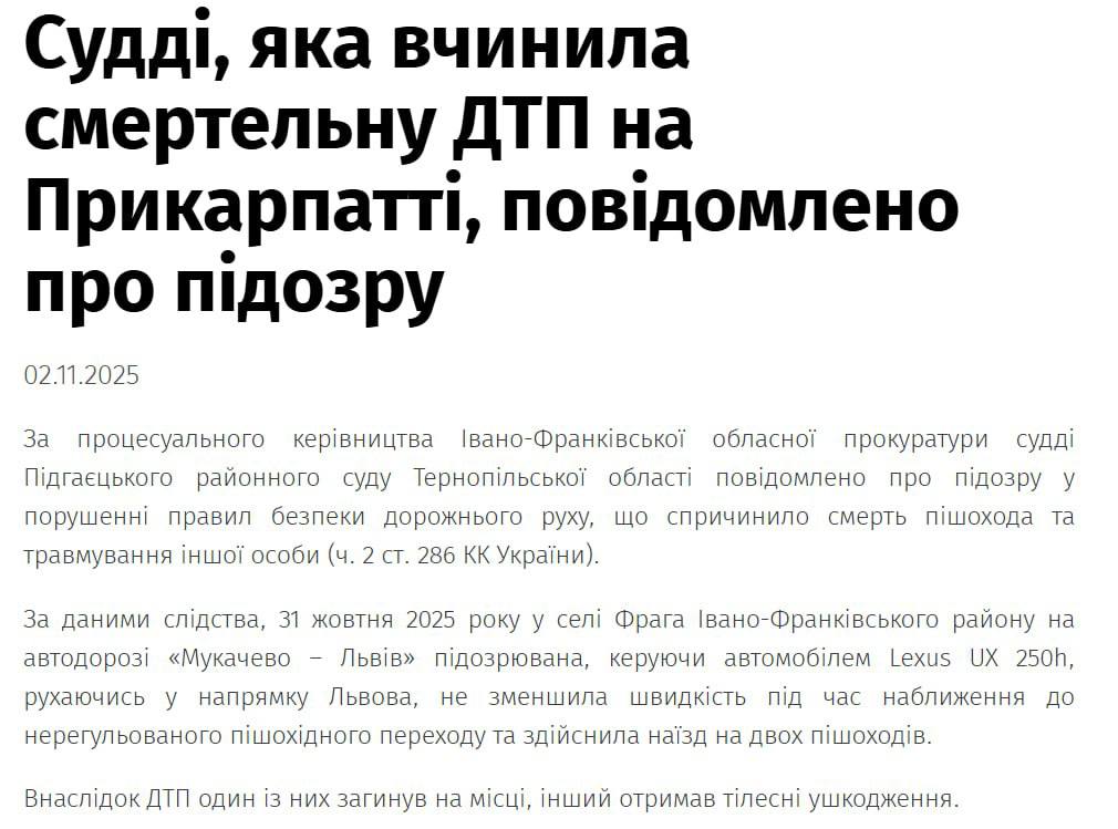 Судья Подгаецкого районного суда Тернопольской области, находившаяся за рулем Lexus UX 250h не стала снижать скорость у пешеходного перехода и наехала на двух человек, переходивших дорогу в этом месте.