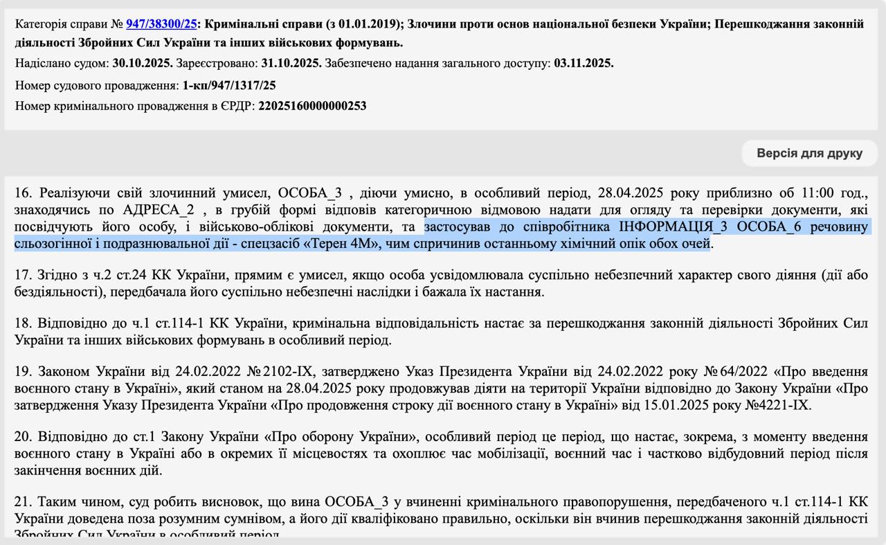 Инцидент произошел 28 апреля. На просьбу предоставить документы мужчина достал газовый баллончик и применил в сторону сотрудника ТЦК, причинив ему химический ожог обоих глаз. После этого мужчина сбежал, но позже вернулся, чтобы найти потерянный наушник, и тогда был задержан.
