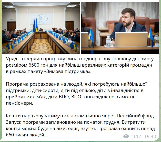 По ее словам, по 6500 грн получат дети-сироты, дети на попечении, дети с инвалидностью в приемных семьях, дети-ВПЛ, ВПЛ с инвалидностью, одинокие пенсионеры.