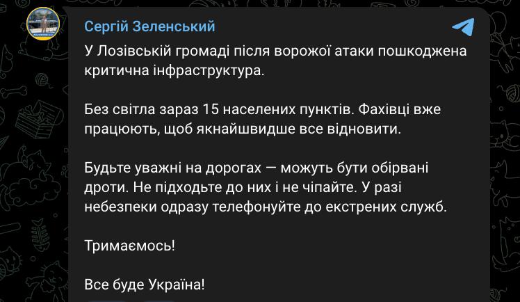08:48 После удара по Лозовой Харьковской области 15 населенных пунктов района остались без света. Об этом сообщил мэр города Сергей Зеленский.