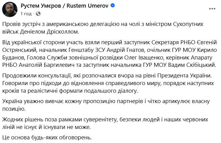 "Продолжили консультации, начатые вчера на уровне президента Украины. Говорили о подходах к восстановлению справедливого мира, порядке последующих шагов и реалистичных форматах дальнейшего диалога. Украина внимательно изучает каждое предложение партнеров и четко артикулирует свою позицию. Никаких решений вне суверенитета, безопасности людей и наших красных линий не существует и существовать не может. Это база всех обсуждений", - заявил Умеров.