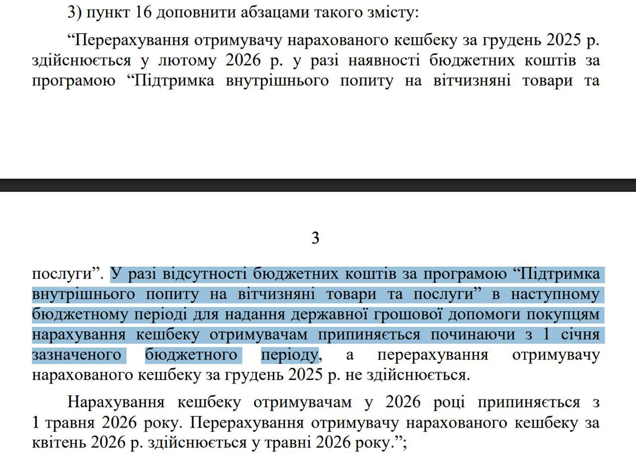 "В случае отсутствия бюджетных средств по программе в следующем бюджетном периоде для предоставления государственной денежной помощи покупателям начисление кешбэка получателям прекращается начиная с 1 января бюджетного периода, а перечисление за декабрь не производится", - говорится в постановлении.