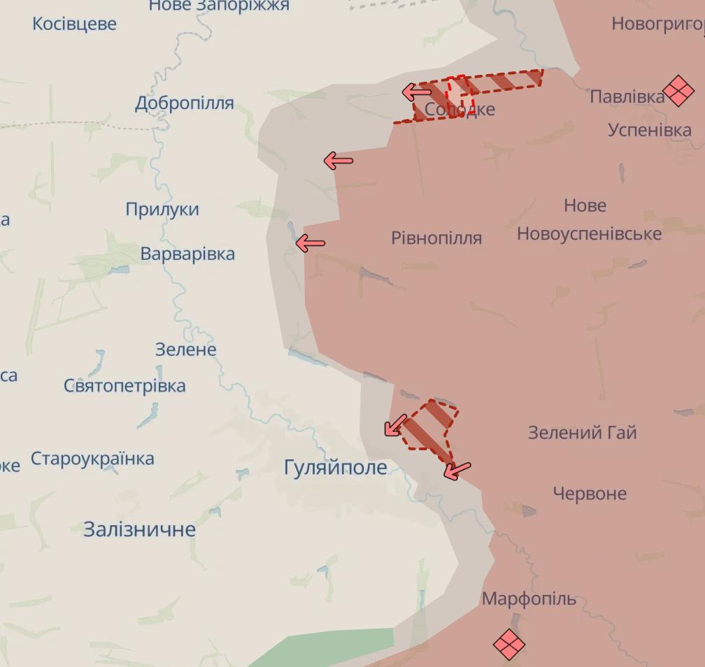 Севернее, где наступают российские подразделения, продолжаются попытки выйти к реке Волчья. Россияне сумели дойти до Орестополя и Новоселовки, частично там закрепившись. Украинские войска удерживают Сосновку и Александроград, что временно сдерживает продвижение, однако российские штурмовые группы продолжают попытки обойти эти позиции, продвигаясь к Новоалександровке и Алексеевке. По оценке эксперта, это создает угрозу своеобразной "изоляции" Гуляйпольского района обороны от сил ВСУ, удерживающих позиции севернее и западнее вдоль Волчьей.