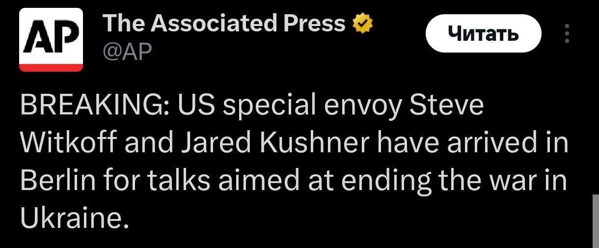 "Стив Уиткофф и Джаред Кушнер прибыли в Берлин для переговоров, направленных на прекращение войны в Украине", - говорится в сообщении.