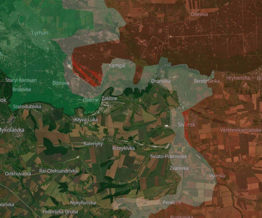 Кроме того, армия РФ продвинулась у Ямполя и Северска. Практически вся территория этих населенных пунктов, согласно карте DeepState, находится либо под контролем россиян, либо в серой зоне.
