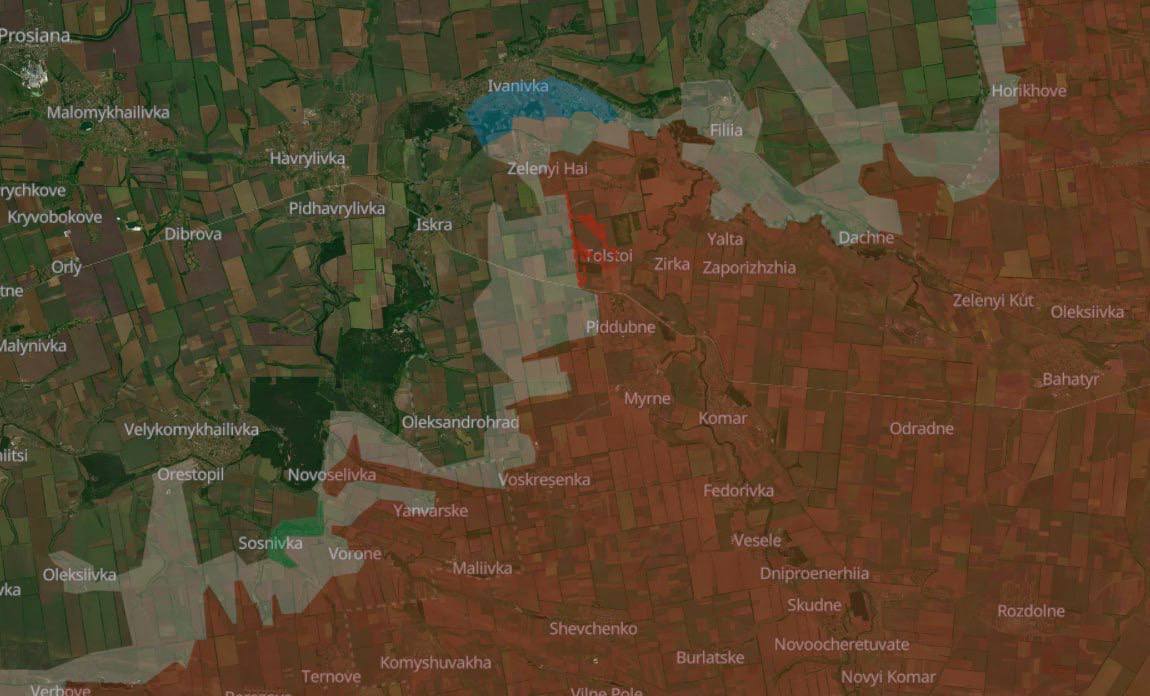 По данным паблика, российские войска захватили село Толстой в Донецкой области близ границы с Днепропетровской.