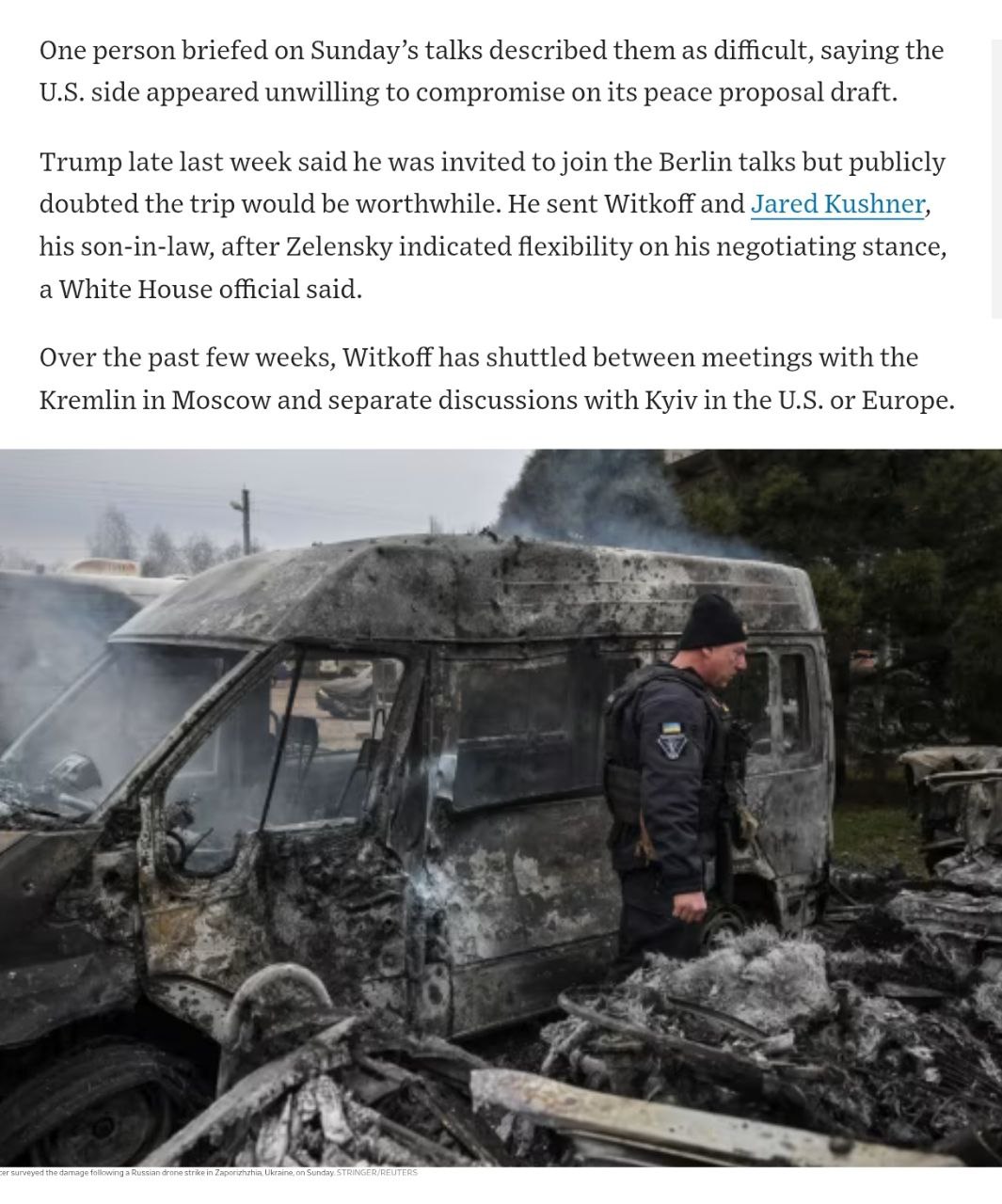 9.04 США на переговорах с Зеленским в Берлине не идут на компромисс по своему проекту мирного соглашения.