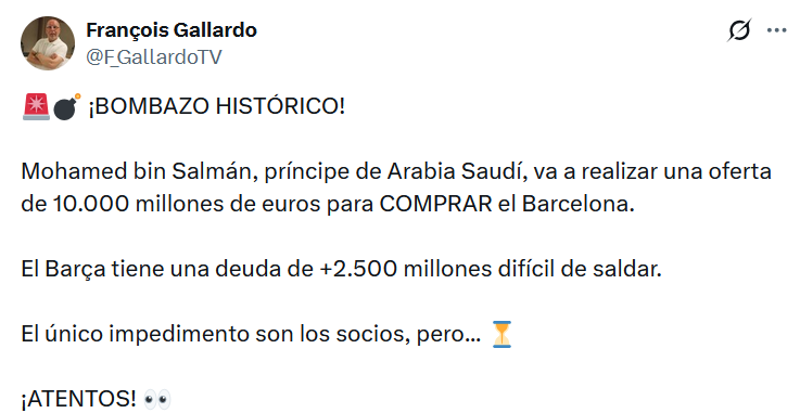Наследный принц Саудовской Аравии предлагает купить футбольный клуб "Барселона". Фото: x.com/F_GallardoTV/